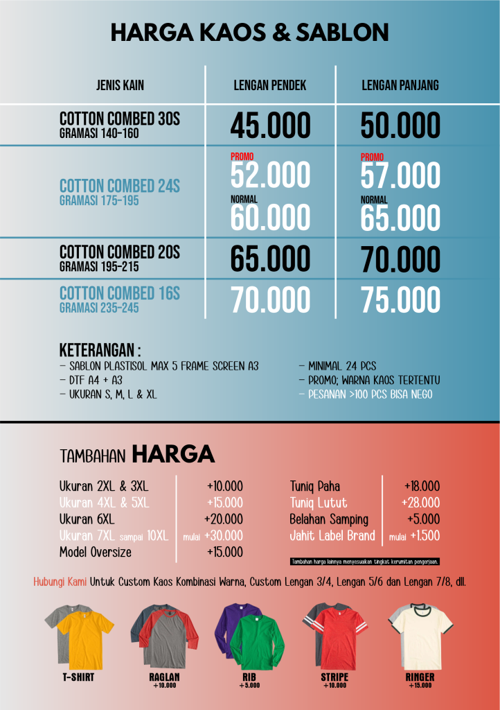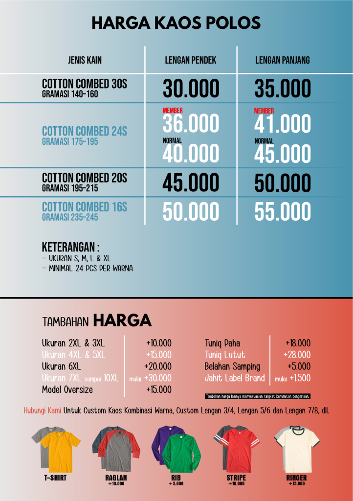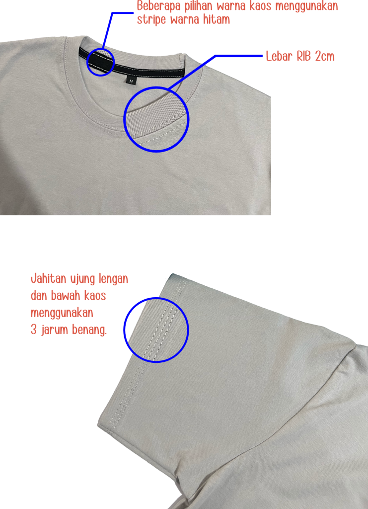 - Produk kami menggunakan bahan kain dari vendor pabrik Knitto Textiles dengan berbagai pilihan jenis kain mulai dari Cotton Combed, Cotton Bamboo, Cotton Modal, Heavy Cotton Roughfeel, dan Cotton Carded.